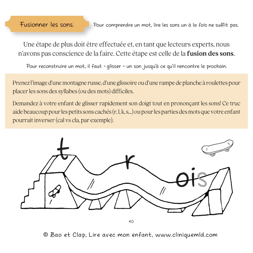 Ensuite, il doit le faire plus rapidement… et ainsi de suite. Jusqu’à ce qu’il réussisse à dire si c’est écrit « par » ou « pra », «bel» ou «ble», «por» ou «pro». La glissade s’utilise aussi en écriture pour vérifier si les sons du mot écrit sont dans le bon ordre. ![]()