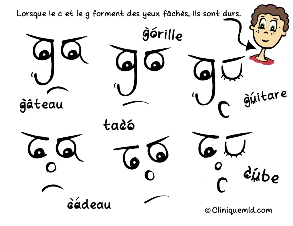 Ce soir, je vous partage un « vieux truc ». 😊 C’est en fait le premier vrai truc que j’ai inventé avec ma toute première élève au privé, en 2009. 😲 En tentant de trouver une logique dans la fameuse règle qui dit que le c et le g sont durs avec le a, le o et le u, 😤 mon élève s’est exclamée: ça fait des yeux! 💡🥳