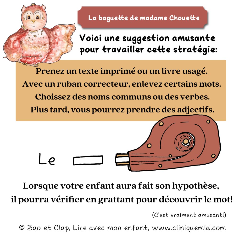 Pour aider votre jeune à utiliser davantage les indices fournis dans le texte, vous pouvez utiliser des textes troués (lacunaires), mais aussi simplement effacer des mots dans un livre pour aider votre jeune à s’exercer. 📚 C’est bien aussi de cacher les illustrations pour amener votre enfant à vraiment chercher dans le texte.