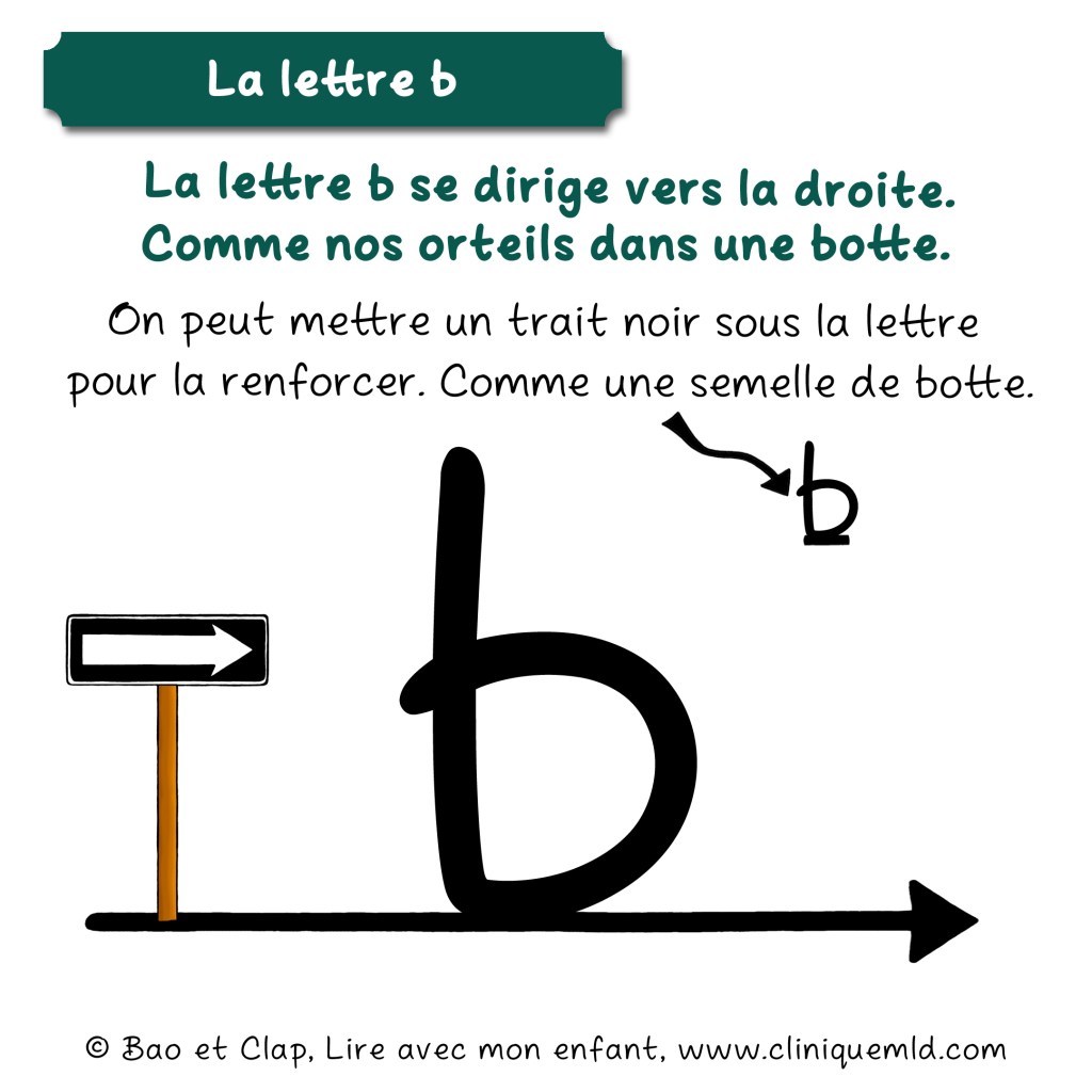 Bon, une fois qu’on a bien démontré qu’il y a un plancher sous les lettres, même si on le voit pas, il faut expliquer que la lettre b s’appuie sur ce plancher, suit le sens du texte et se dirige vers la droite. ➡️