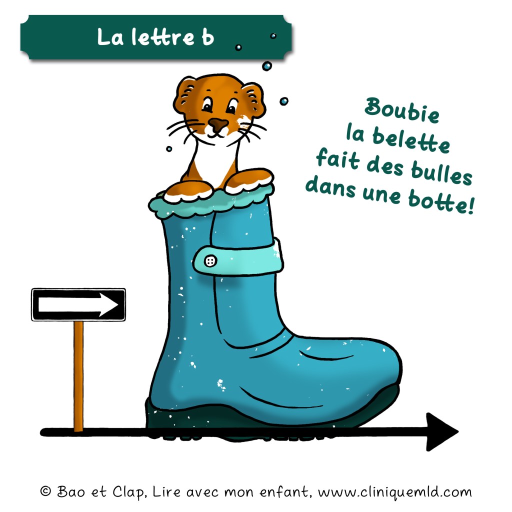J’utilise l’image d’une botte parce que pour moi c’est plus logique étant donné que le cercle de la lettre b est au bas de la lettre, appuyé sur la ligne invisible du texte. C’est plus sensé que l’idée de dire que c’est un « bedon » (où sont les jambes?🙀) Il y a aussi le truc qui consiste à utiliser la lettre majuscule B. La lettre b (minuscule) rentre dans la grande. Mais je trouve que c’est plus ludique avec Boubie la belette!